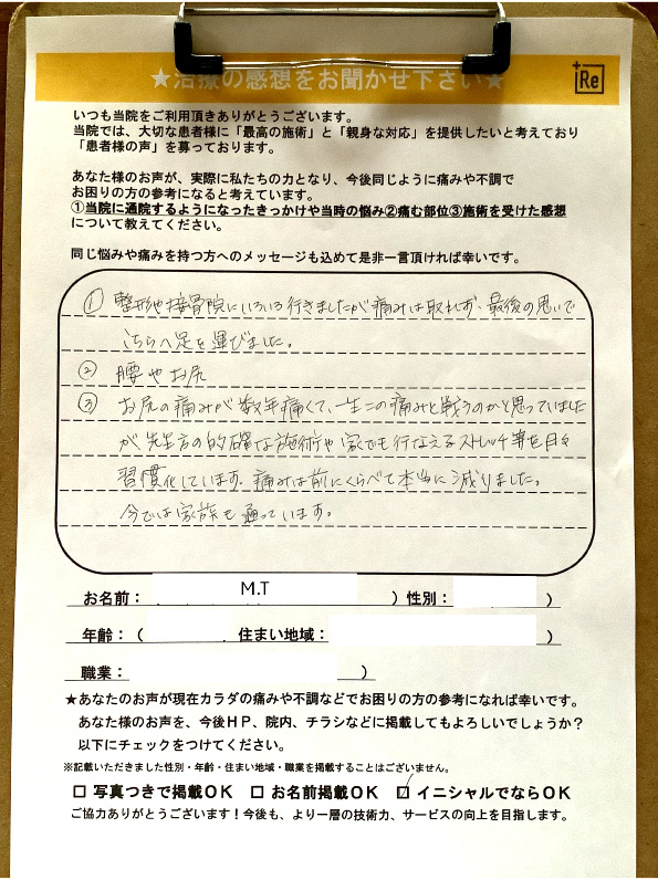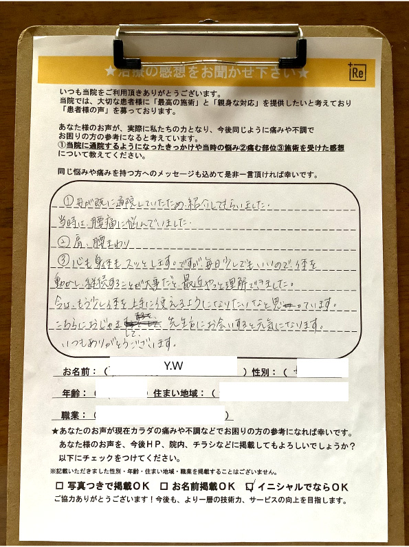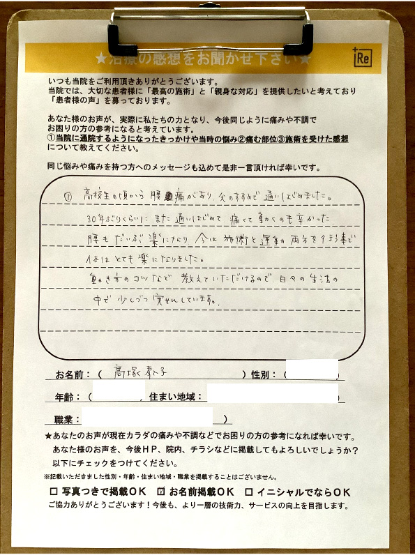 今後の施術方針や通い方、ご自宅での過ごし方、ホームエクササイズなどをアドバイスさせていただきます。