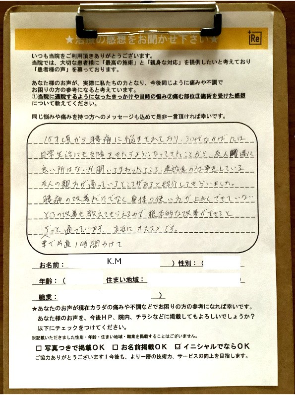 所沢の因泥接骨+Rebodyではこのような施術で腰痛を発生させている原因である、カラダのゆがみ・間違った動き・悪いクセを改善して腰痛を早期改善し、正しい位置・正しい動き・良いクセを定着させることで腰痛の再発予防までサポートさせて頂きます。