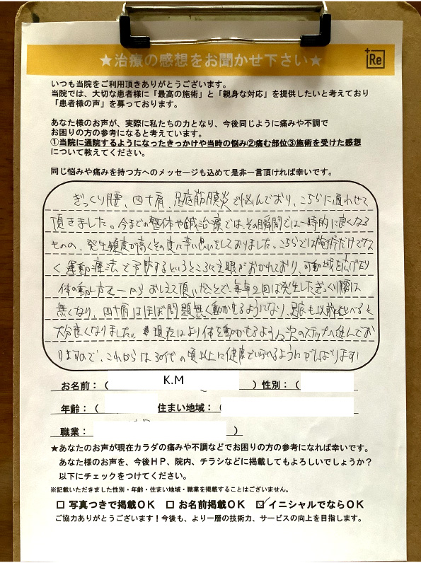 今後の施術方針や通い方、ご自宅での過ごし方、ホームエクササイズなどをアドバイスさせていただきます。