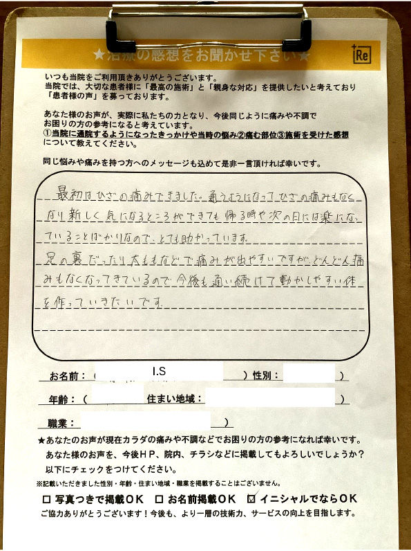 所沢の因泥接骨+Rebodyではこのような施術で鵞足炎を発生させている原因である、カラダのゆがみ・間違った動き・悪いクセを改善して鵞足炎を早期改善し、正しい位置・正しい動き・良いクセを定着させることで鵞足炎の再発予防までサポートさせて頂きます。