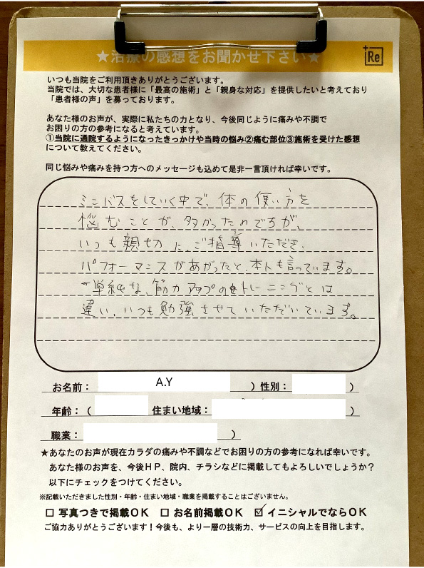 いつも親切にご指導いただき、パフォーマンスが上がったと本人も言っています。