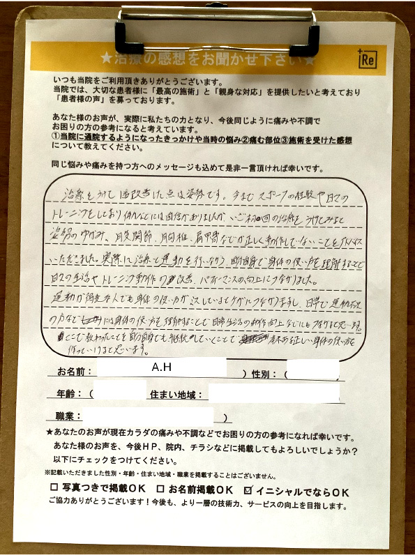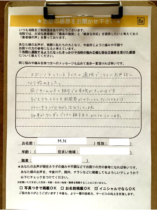 子どもたち2人とも股関節がかたいとのアドバイスをうけストレッチをつづけながら治療しています。 効果が少しずつでてきて親子共々感謝しています。