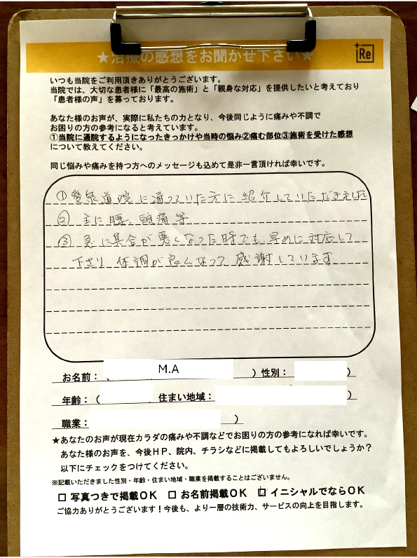 この手技療法および運動療法では所沢の因泥接骨+Rebody独自の『自動介助運動アプローチ』の技術を用いており、正しい動作の反復を用いてよいクセの定着を行います。